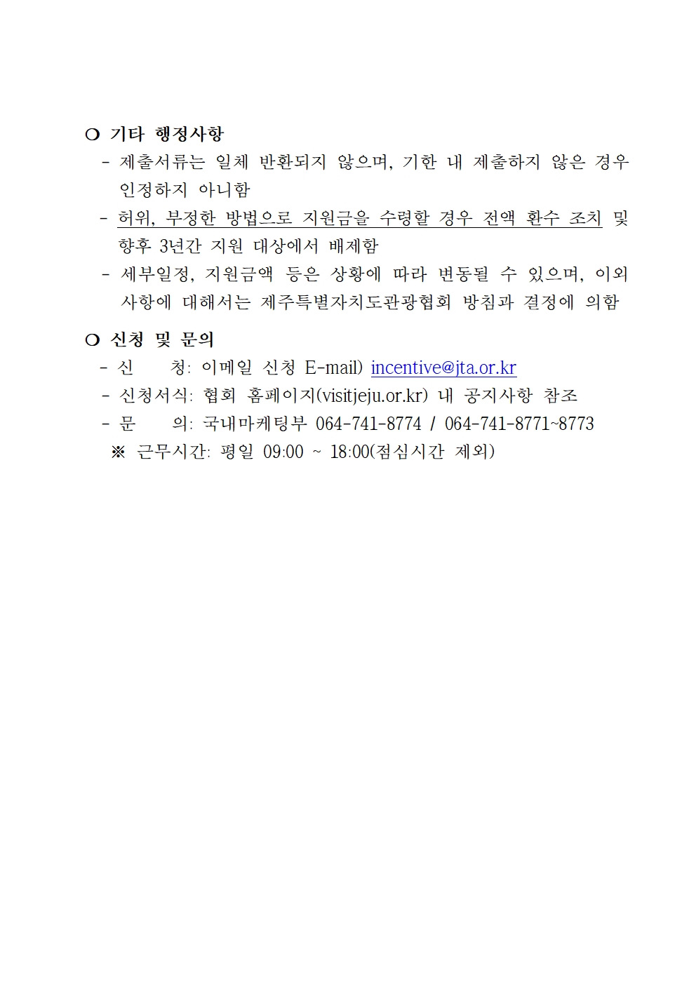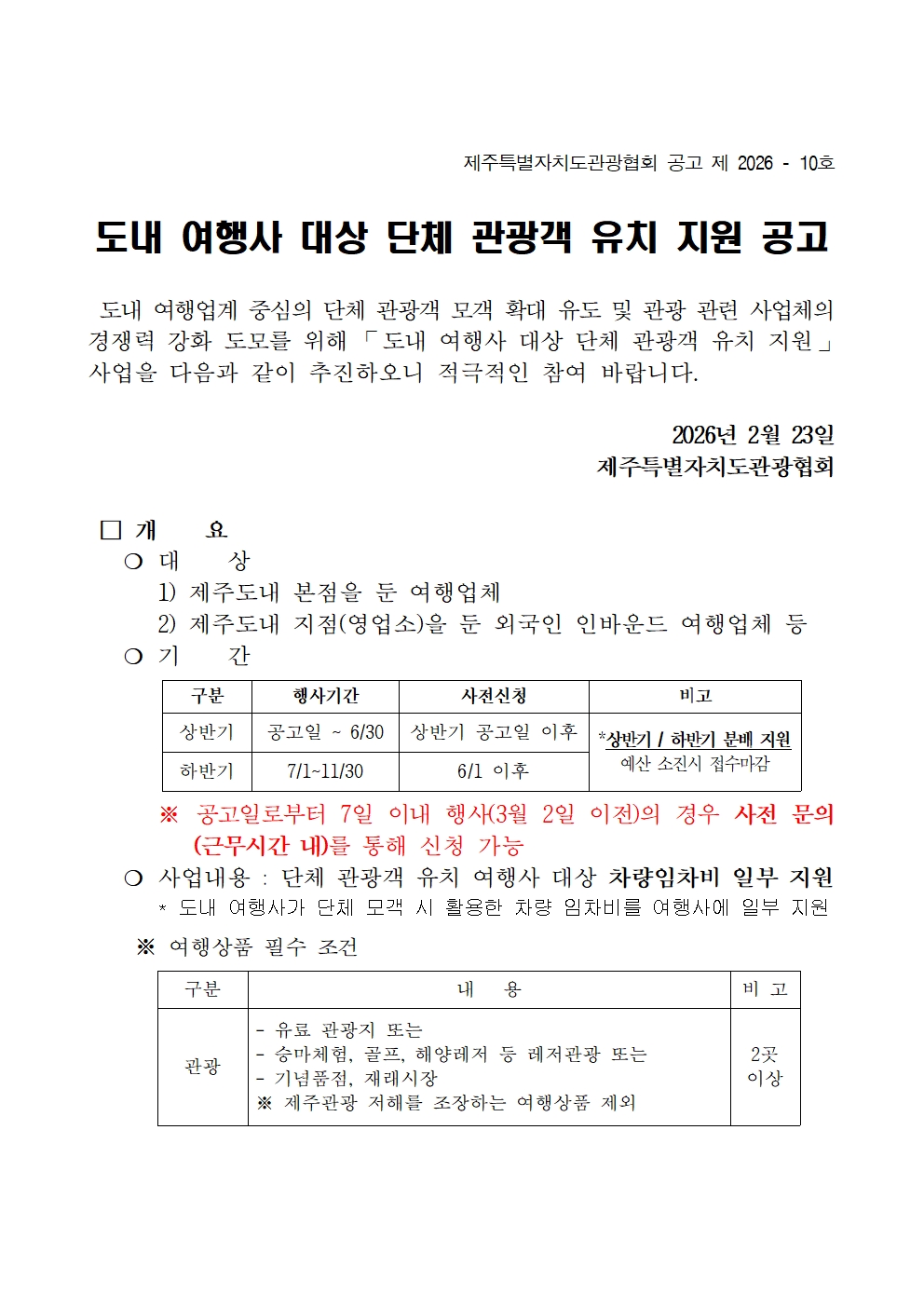 ※※ 도내 여행사 대상 단체 관광객 유치 지원 공고 사업의 "상반기 지원"은 2026년 3월 9일 (월) 15:00를 기점으로 사전 신청이 마감되었습니다.