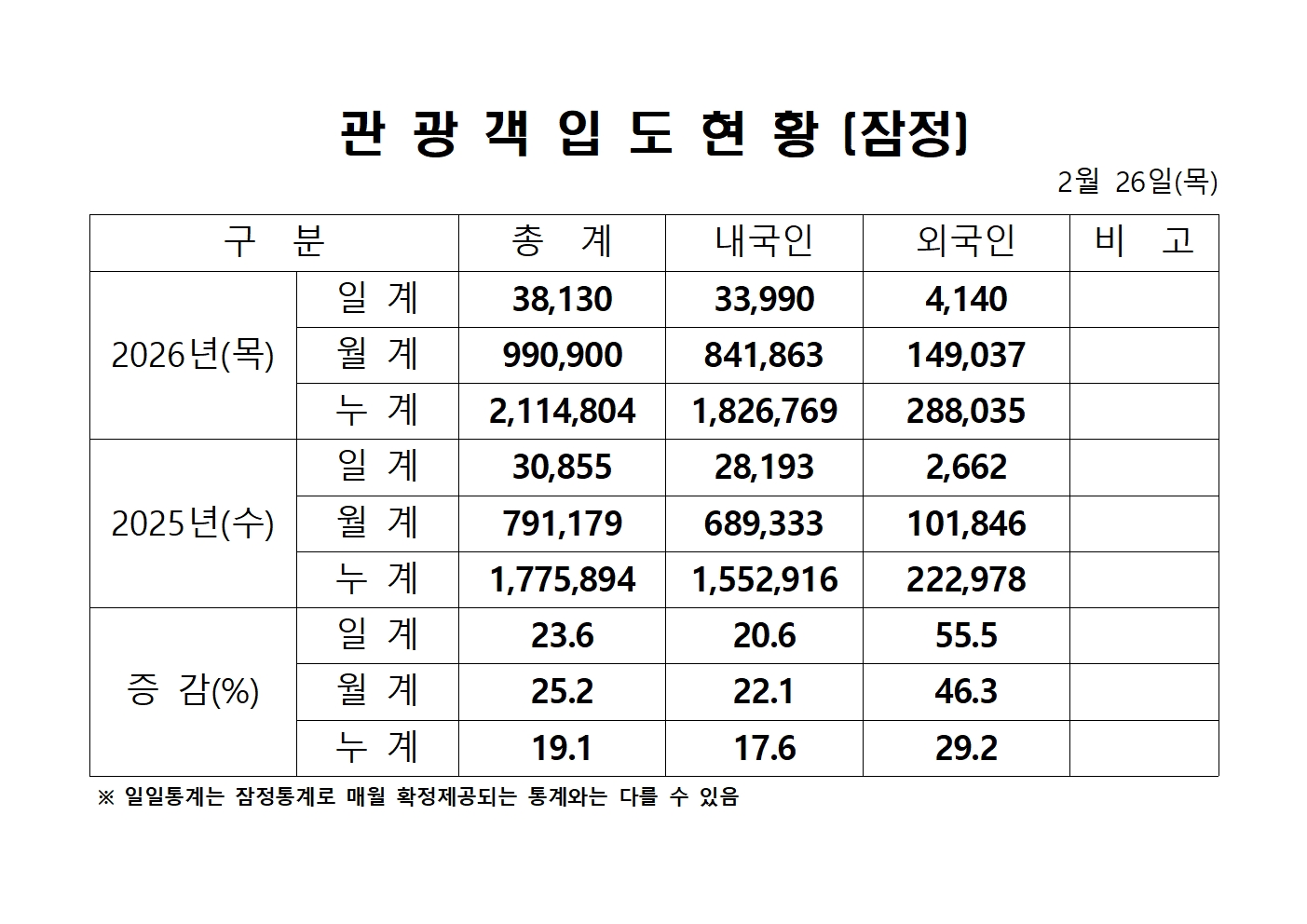 2026년 2월 26일(목) 관광객내도현황