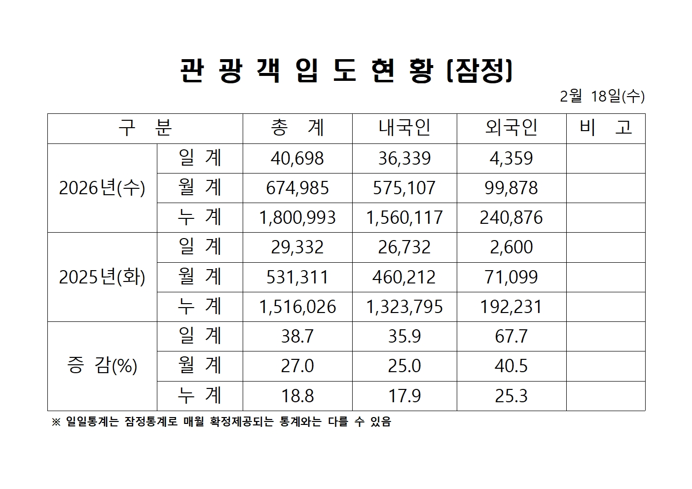 2026년 2월 18일(수) 관광객내도현황