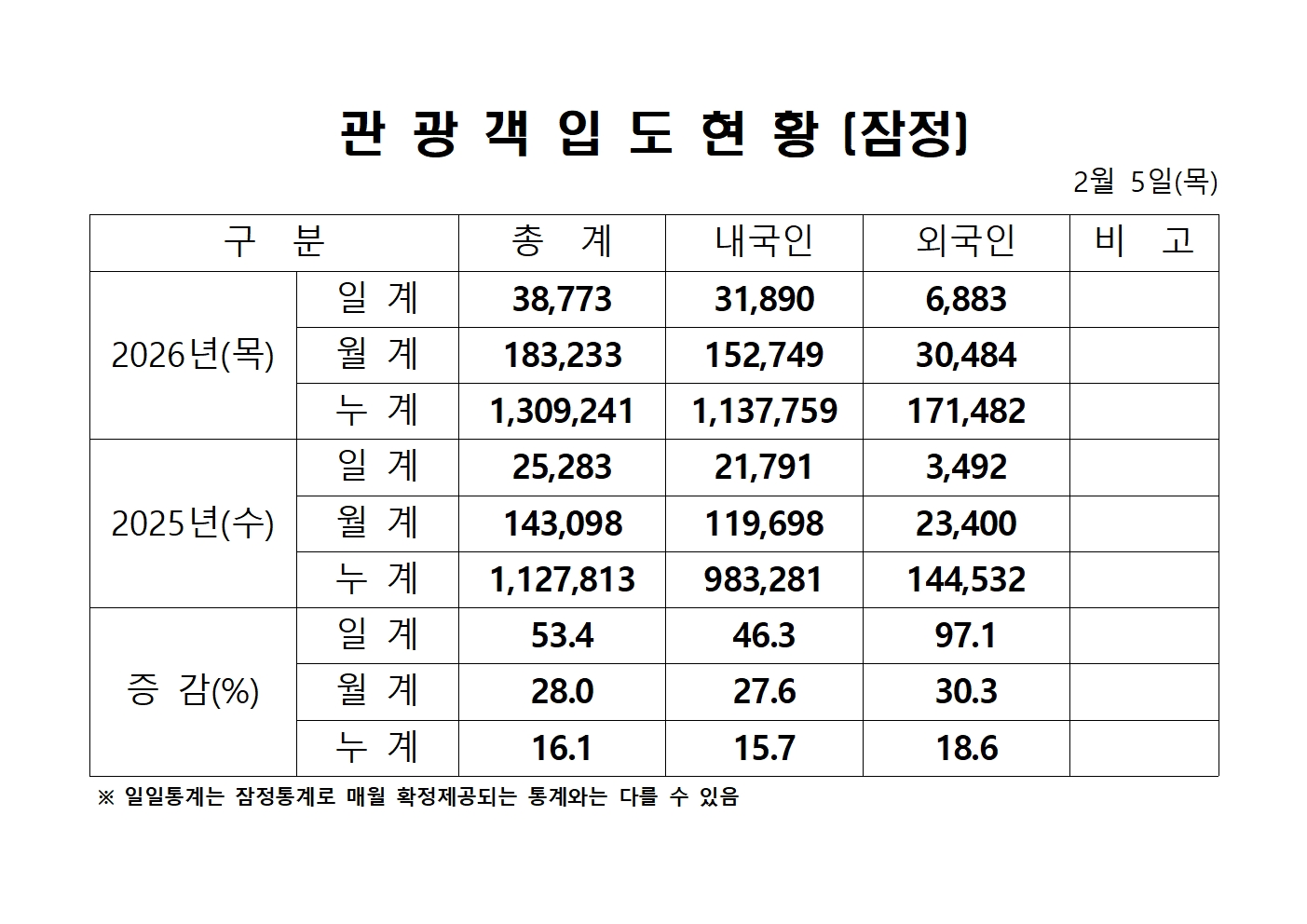 2026년 2월 5일(목) 관광객내도현황