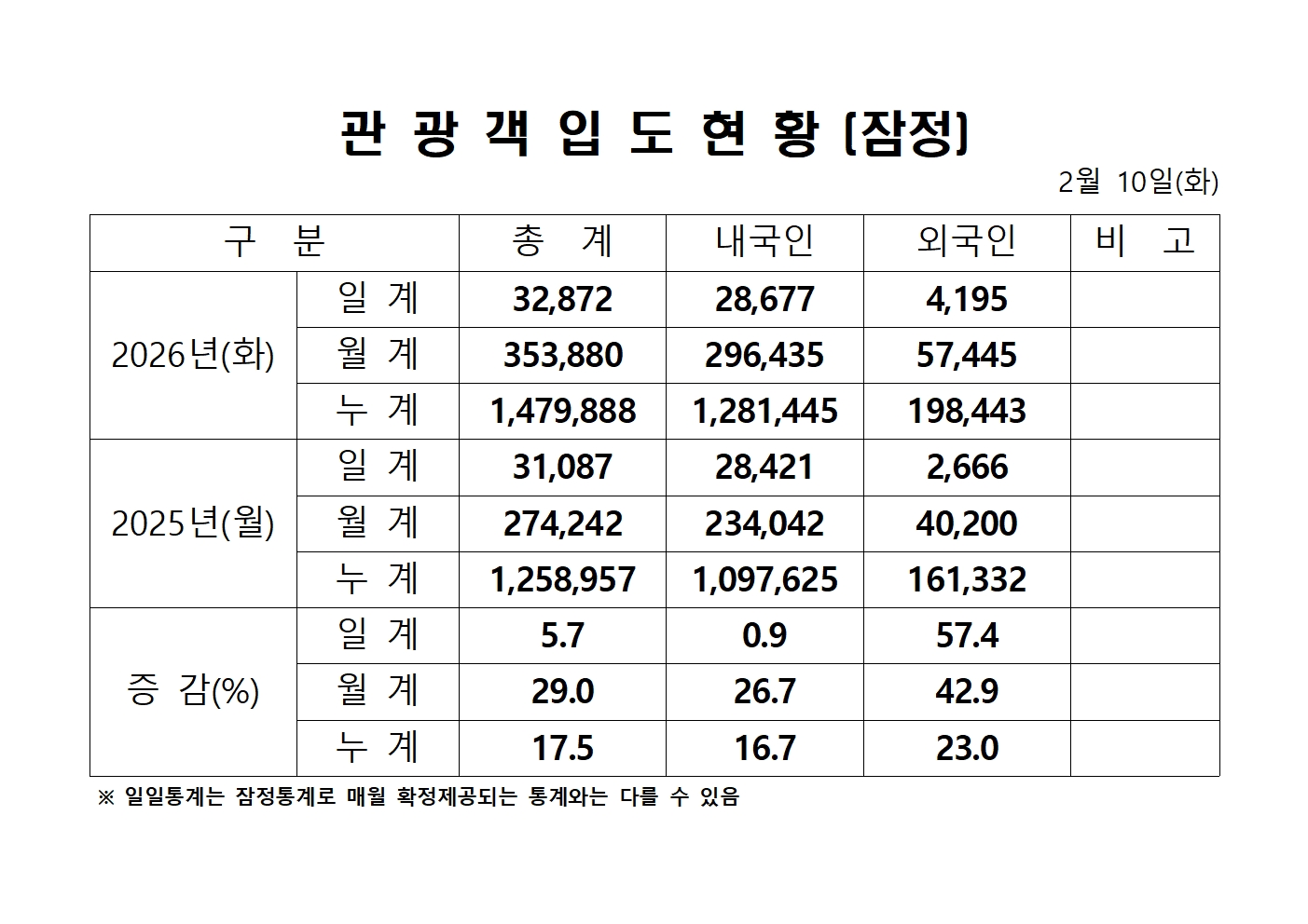 2026년 2월 10일(화) 관광객내도현황