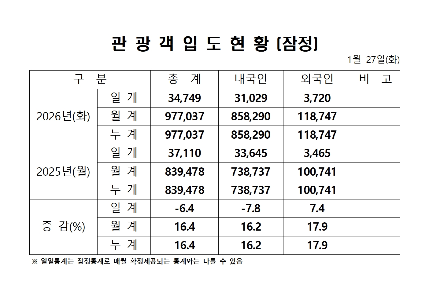 2026년 1월 27일(화) 관광객내도현황
