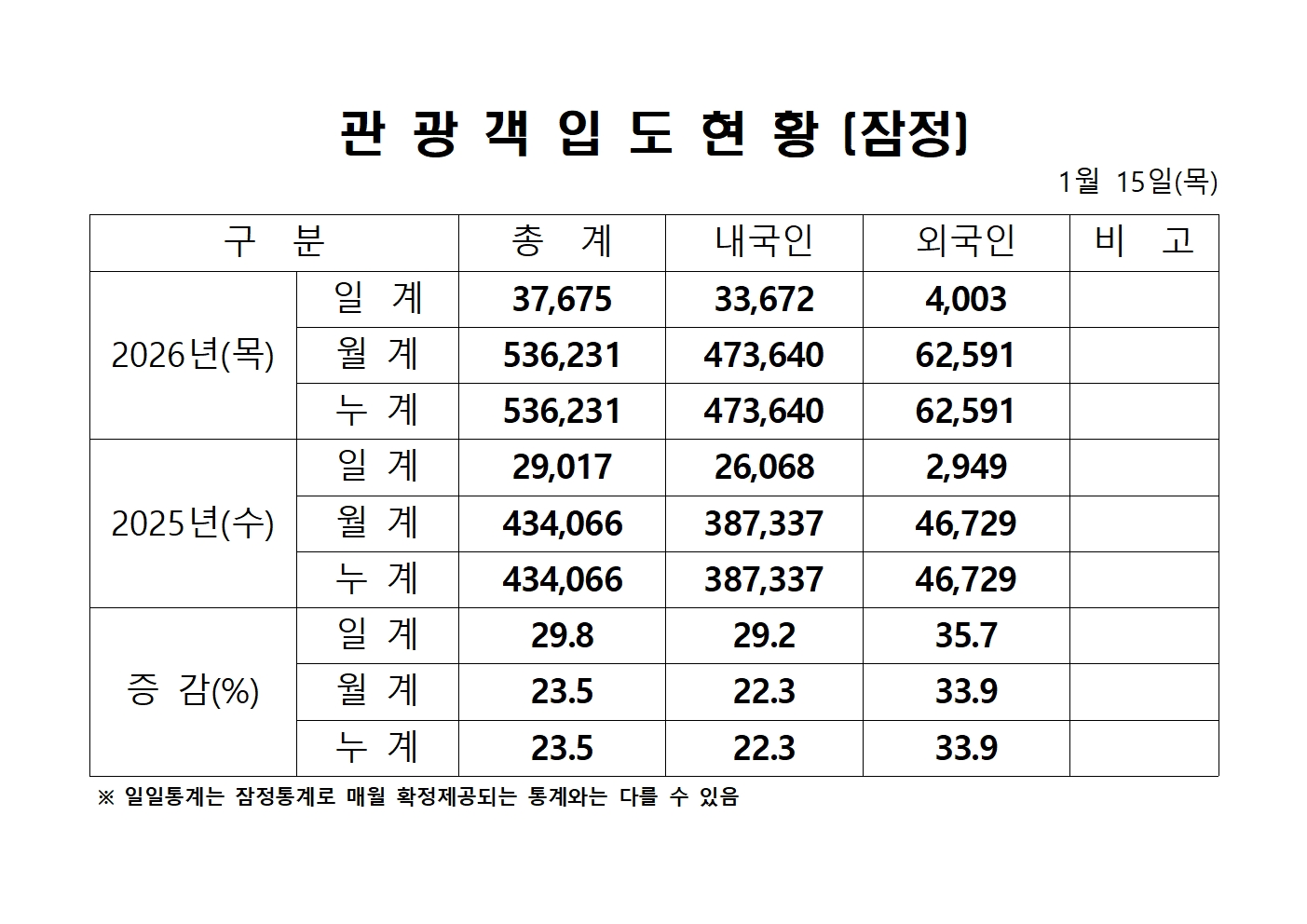 2026년 1월 15일(목) 관광객내도현황