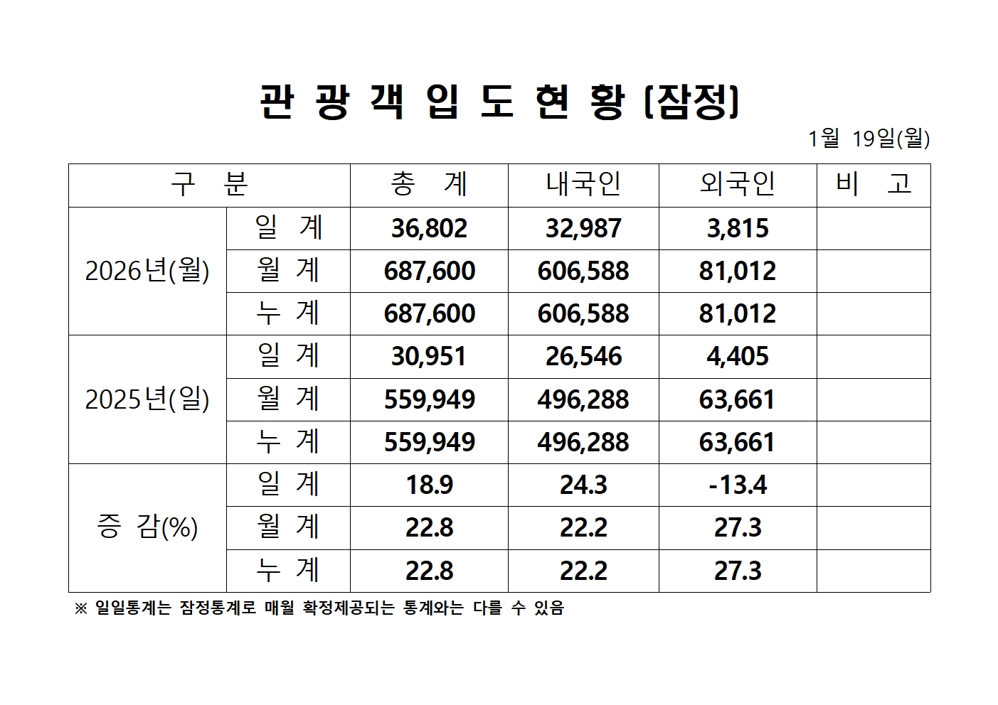 2026년 1월 19일(월) 관광객내도현황