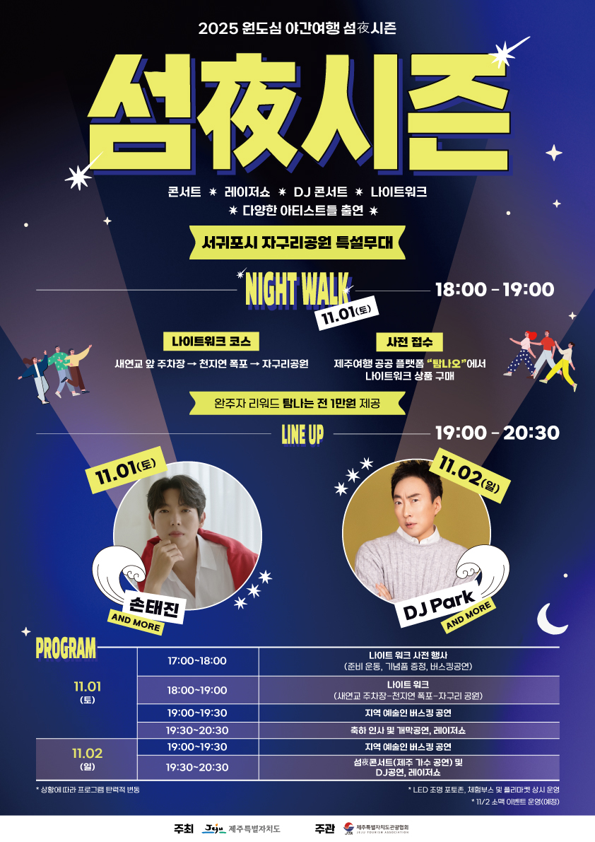 특히, 축제 첫날(11월 1일) 일상의 분주함을 잠시 내려놓고, 고즈넉한 밤 속 자연과 교감하며 걷는 「섬夜 나이트워크」가 개최되며, 코스는 △서귀포항과 새섬을 연결하는 밤바다 랜드마크 새연교 △산책로와 울창한 수림, 야간 조명으로 밝혀진 천지연 폭포△도심 속 쉼터 자구리공원을 돌아보는 순서로, 「제주여행 공공 플랫폼 탐나오(www.tamnao.com)」에서 참가자 2,000명을 사전 모집하고 있으며, 현장에서 참가자 전원 야광팔찌, 머리띠, 삼다수 등 기념품을 증정할 계획으로, 완주자에겐 탐나는전 1만원도 지급된다.