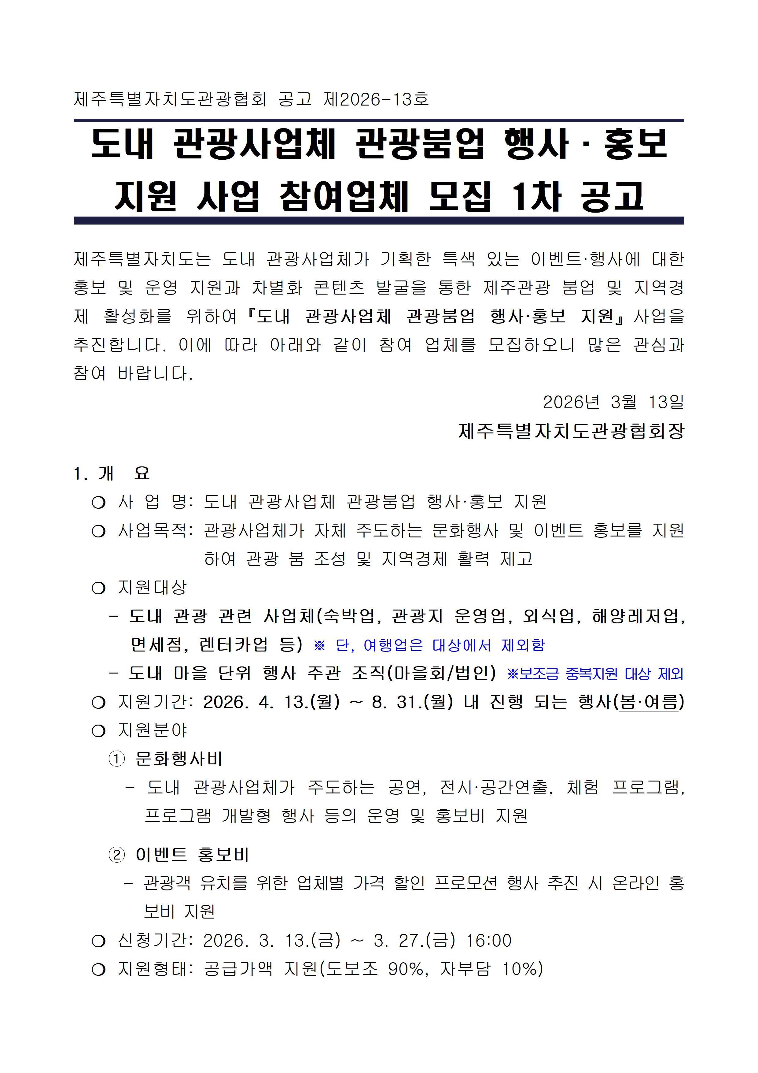 2026 도내 관광사업체 관광붐업 행사·홍보 지원 사업 참여업체 모집 1차 공고