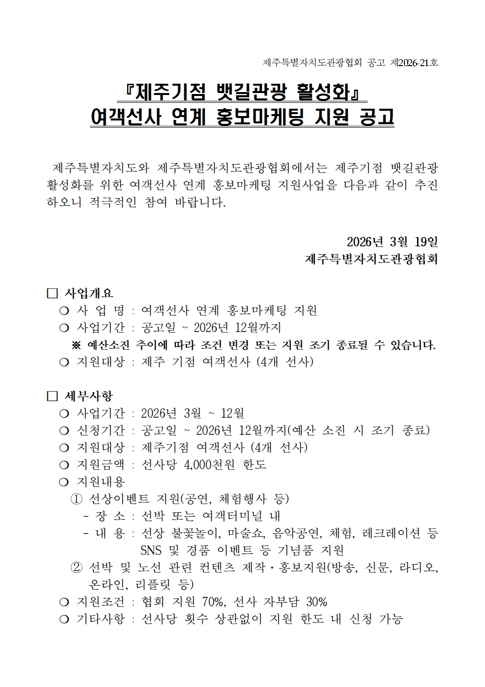 『2026 제주기점 뱃길관광 활성화』 여객선사 연계 홍보마케팅 지원 공고