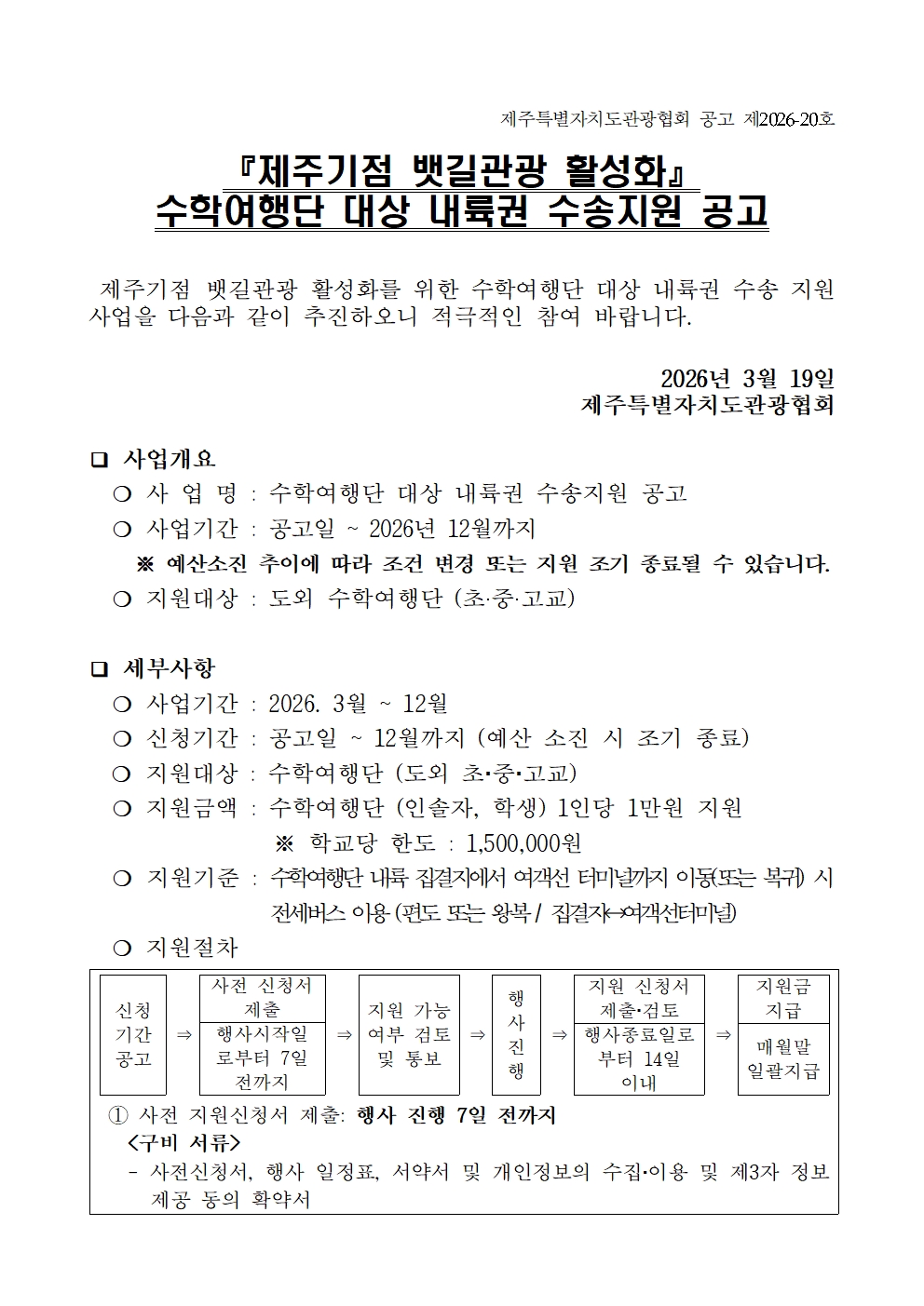 『2026 제주기점 뱃길관광 활성화』 수학여행단 대상 내륙권 수송 지원 공고