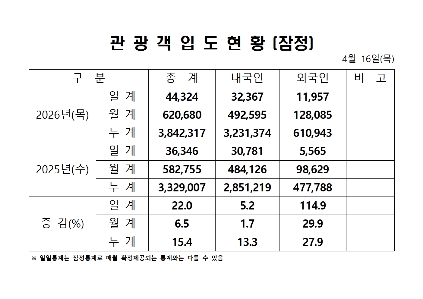 2026년 4월 16일(목) 관광객 내도현황