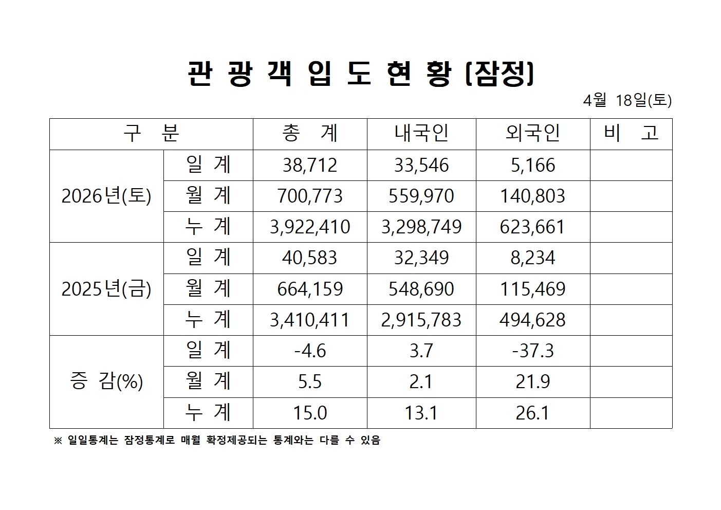 2026년 4월 18일(토) 관광객 내도현황
