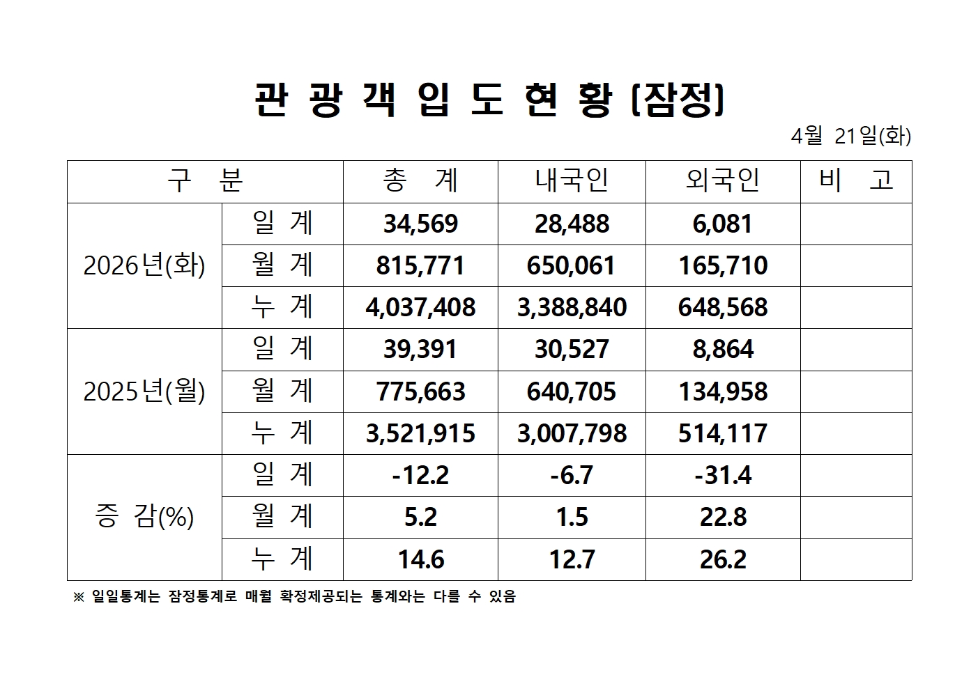 2026년 4월 21일(화) 관광객 내도현황