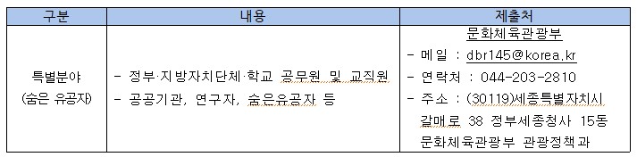 2. 이와 관련하여 관광분야 현장에서의 ‘미담(美談) 사례’를 발굴하여 우수사례의 숨은 유공자를 포상대상자로 추천하고자 하오니, 이에 적합한 사례가 있을 경우 아래의 내용을 참고하시어 2026. 5. 4.(월)까지 접수기관(문체부)로 접수해주시기 바랍니다.